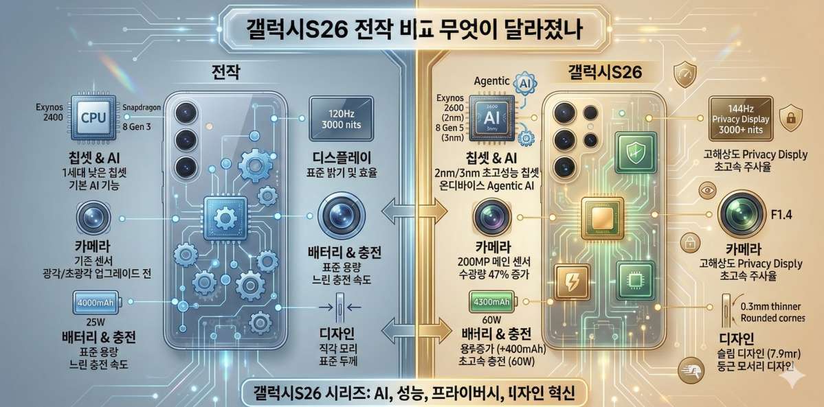갤럭시S26 전작 비교 무엇이 달라졌나를 중심으로 최신 유출 정보와 업계 분석을 종합해보면, 성능 향상과 AI 기능 강화, 카메라 센서 개선이 핵심 변화로 꼽히며 구매 전 반드시 체크해야 할 포인트가 명확해졌습니다.